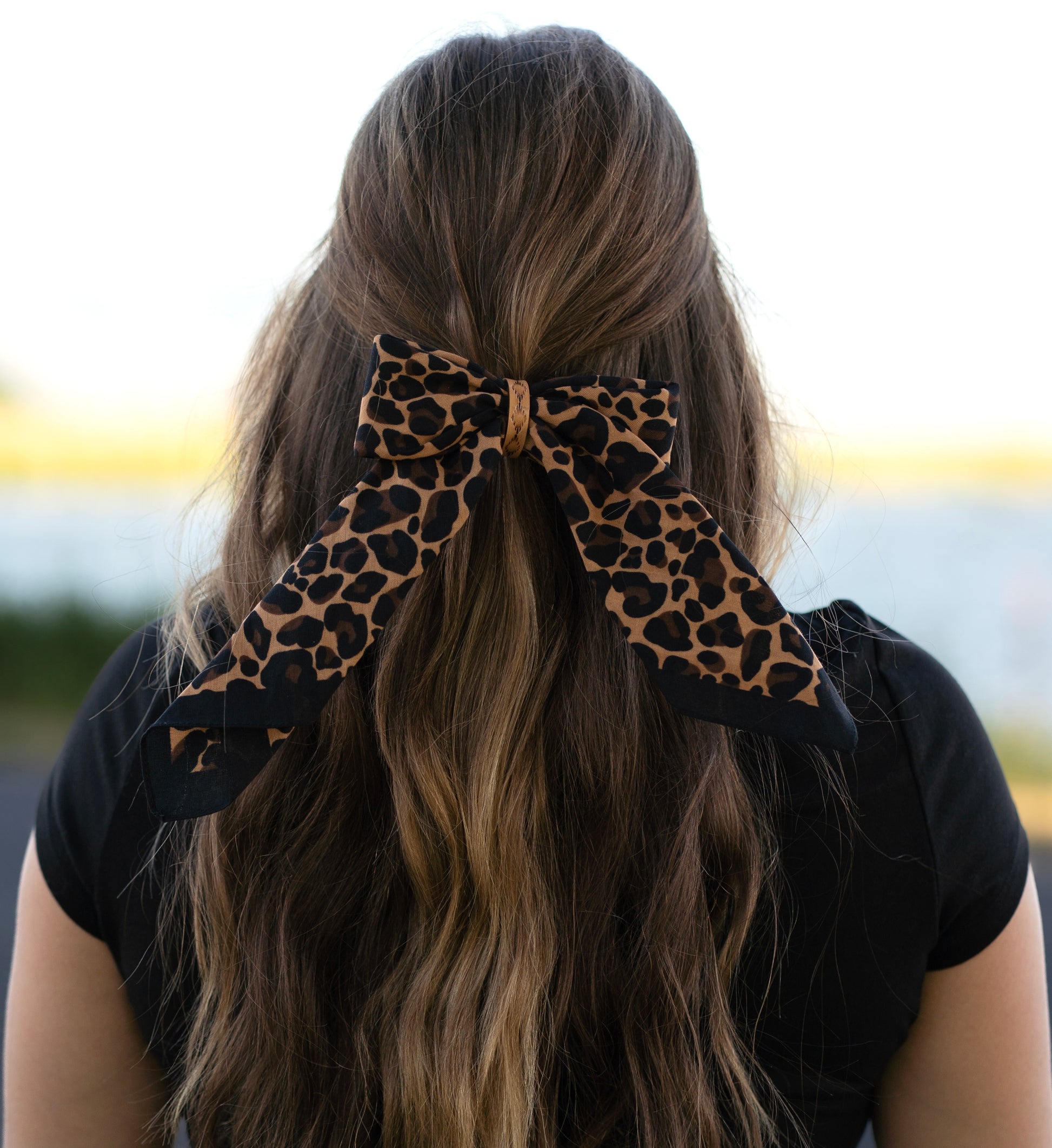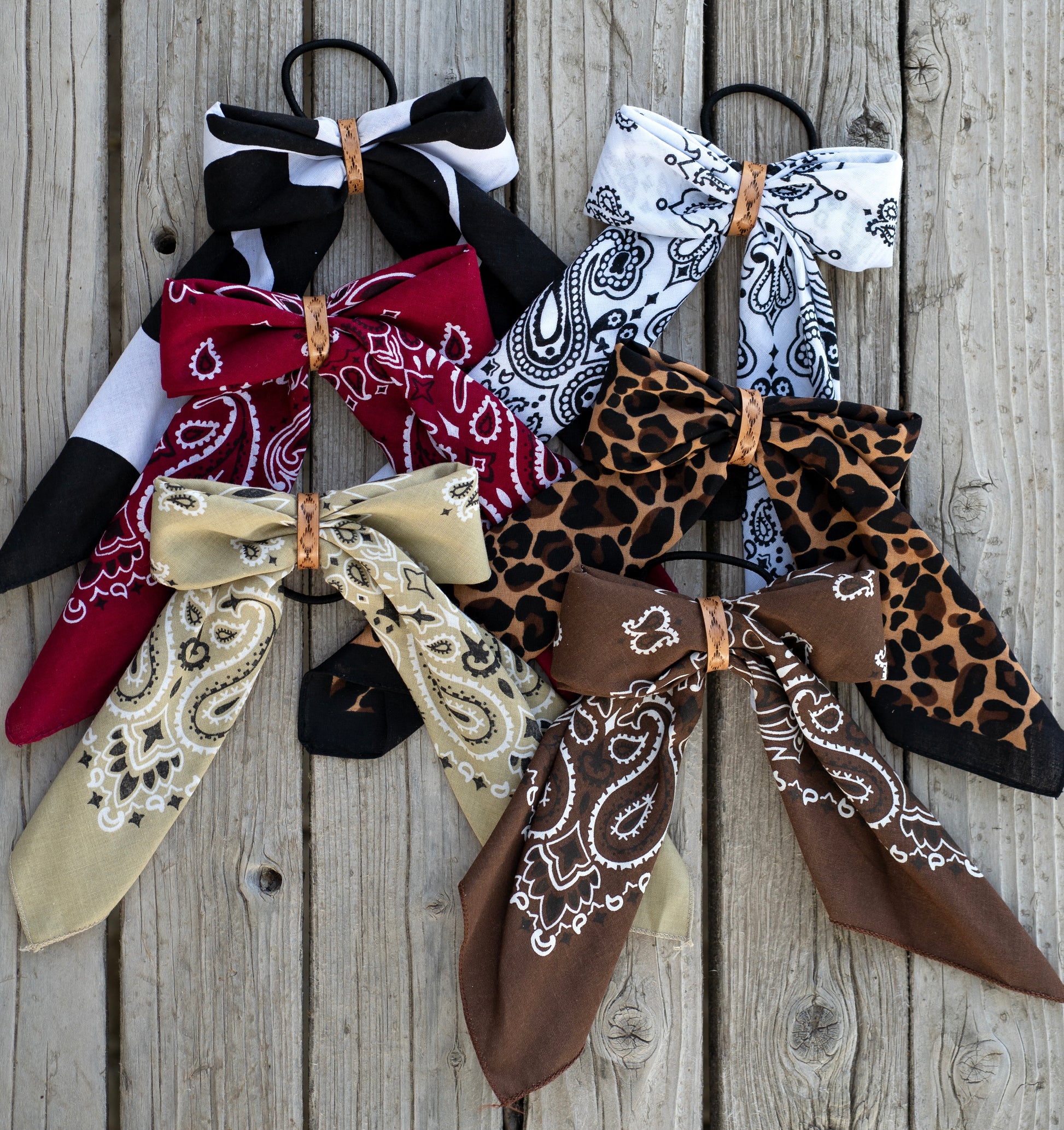 Bandana hair bows with genuine leather stamped center piece. These come with a hair tie attached for easy application.