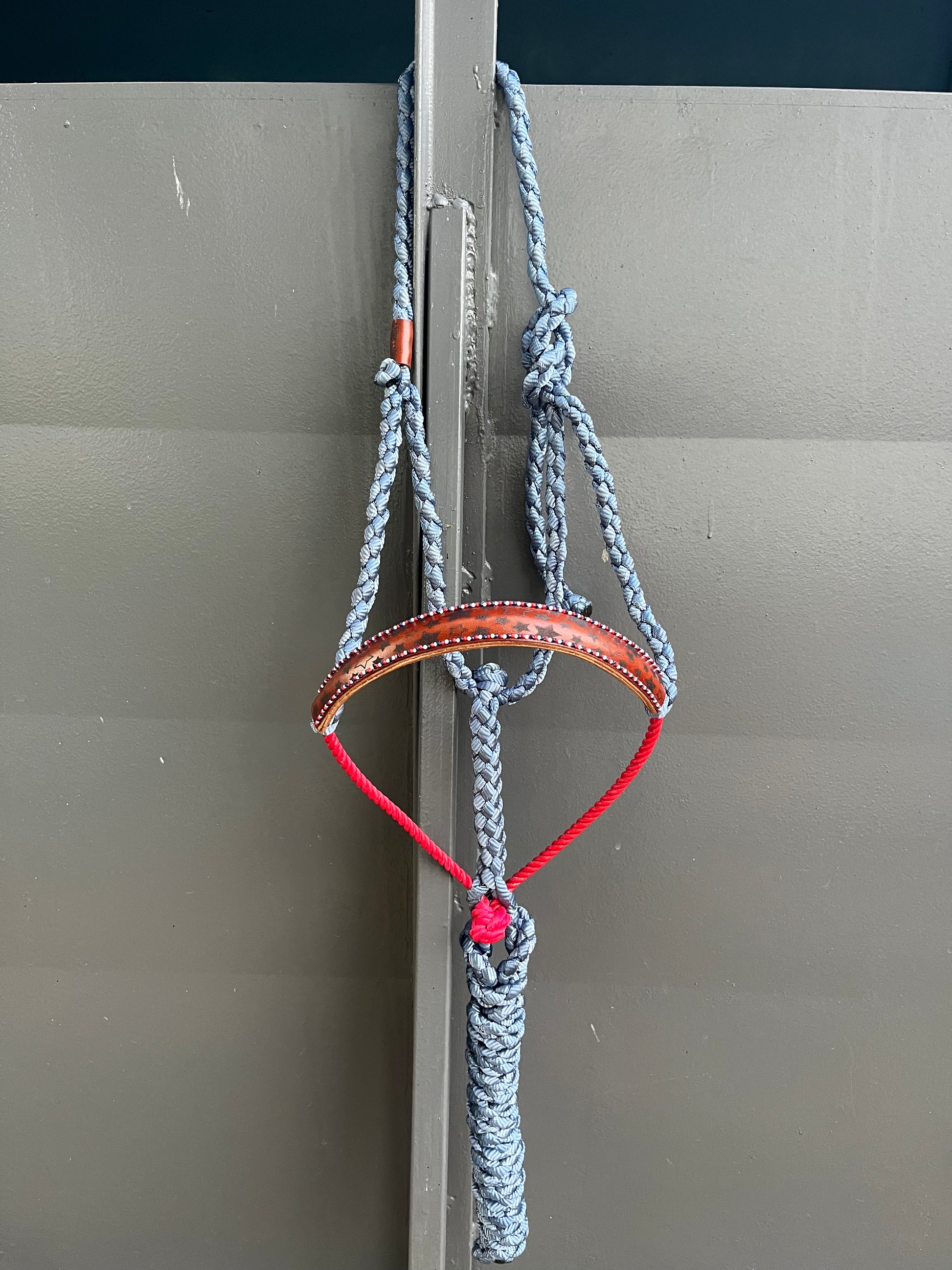 Horse size halter with denim blue mule tape and red lariat rope for the nose band. Laser engraved leather nose band was hand beading and stitched with red, white and navy blue beads.Β