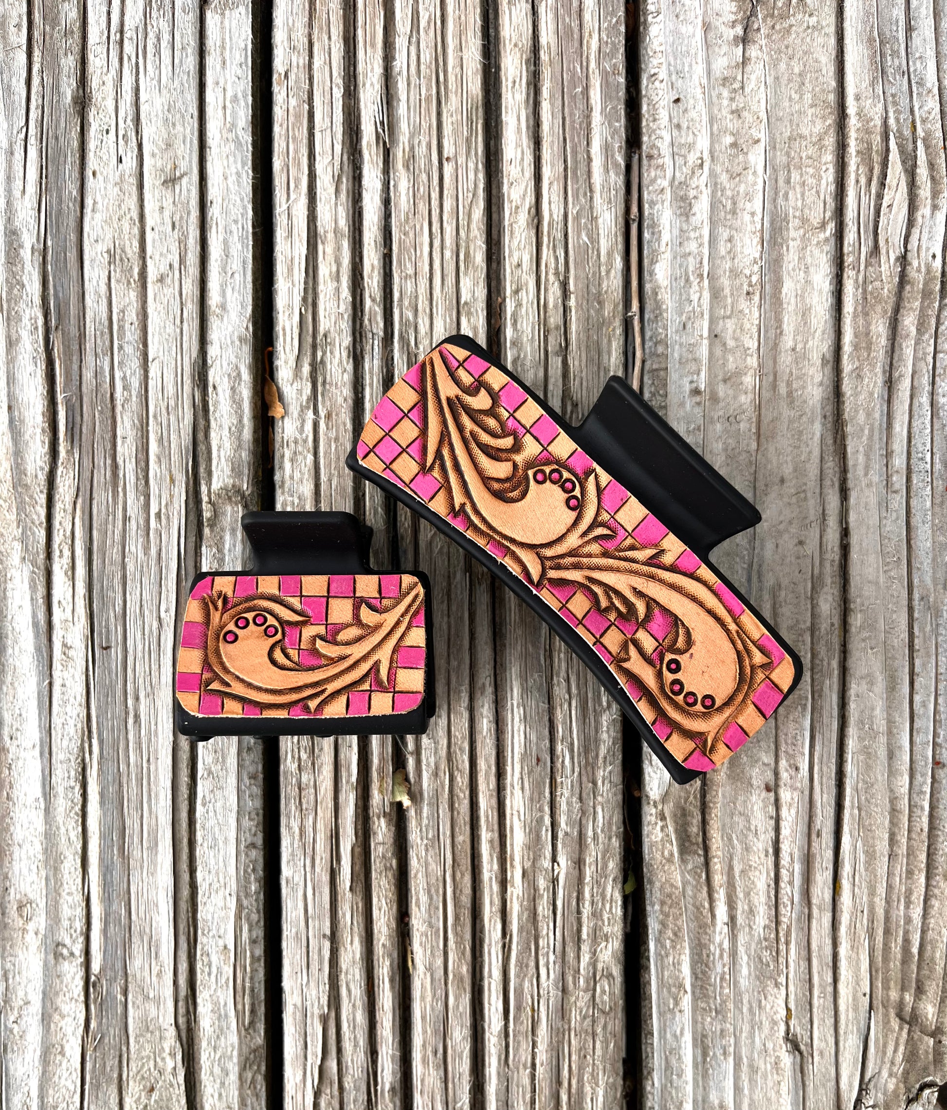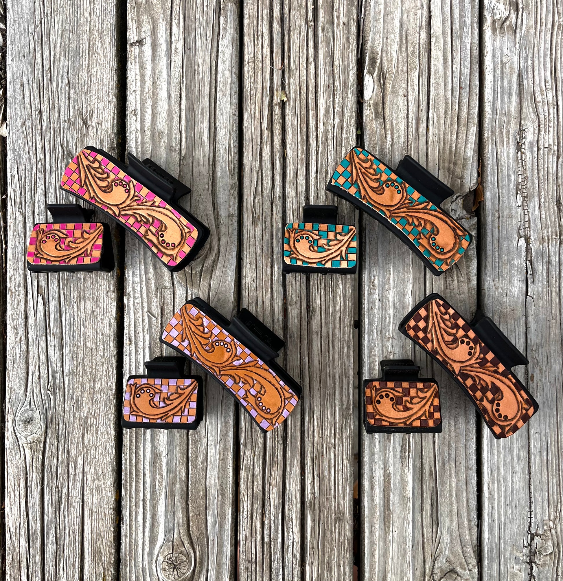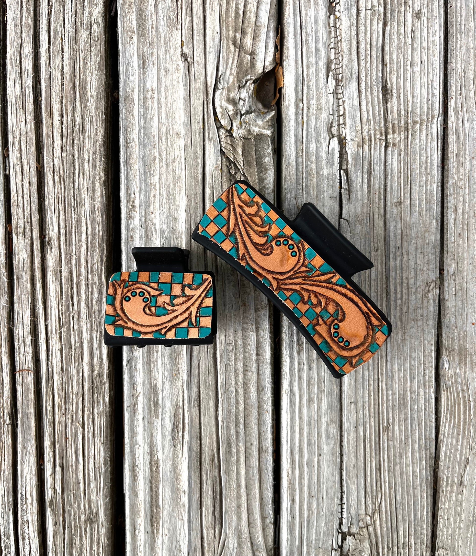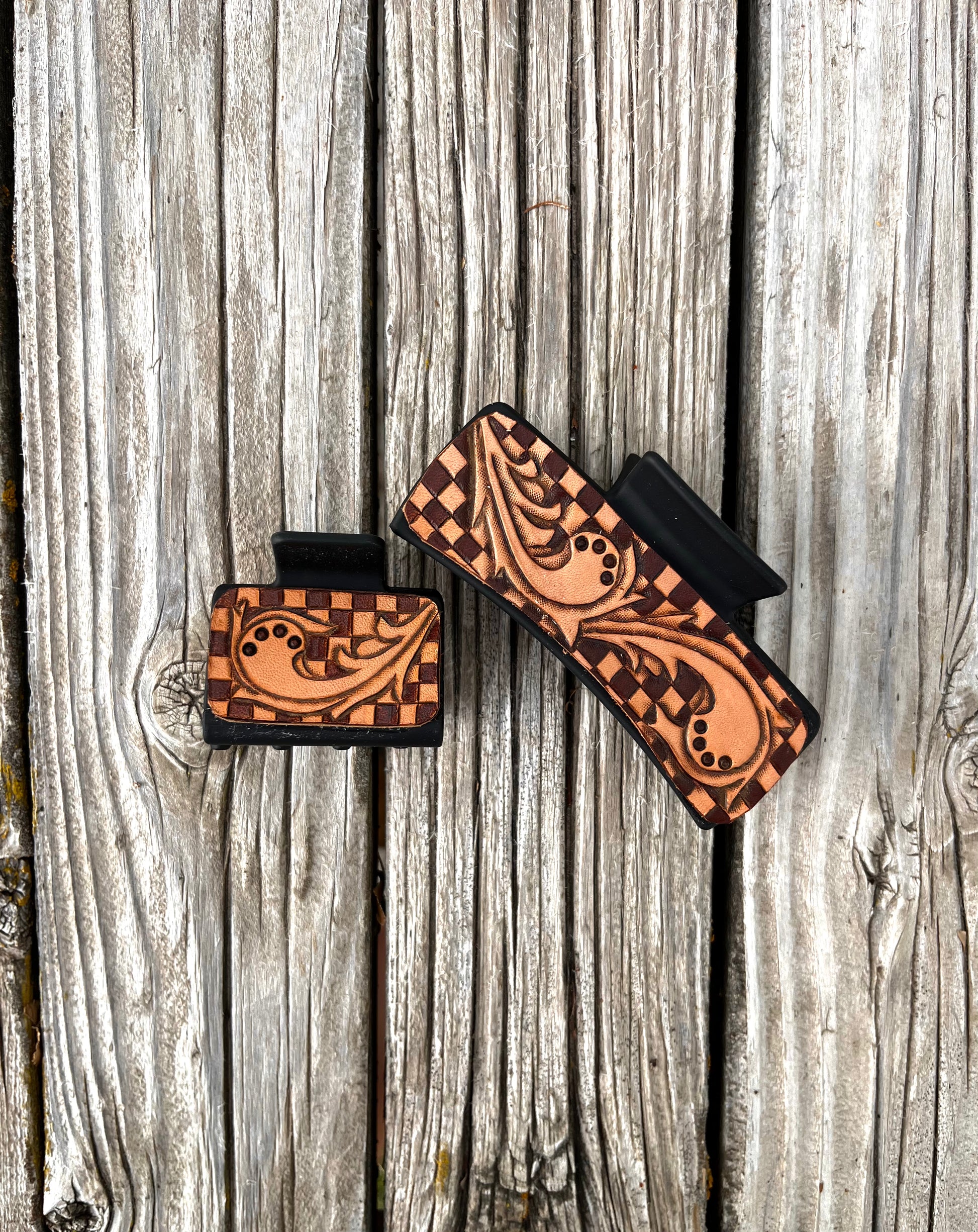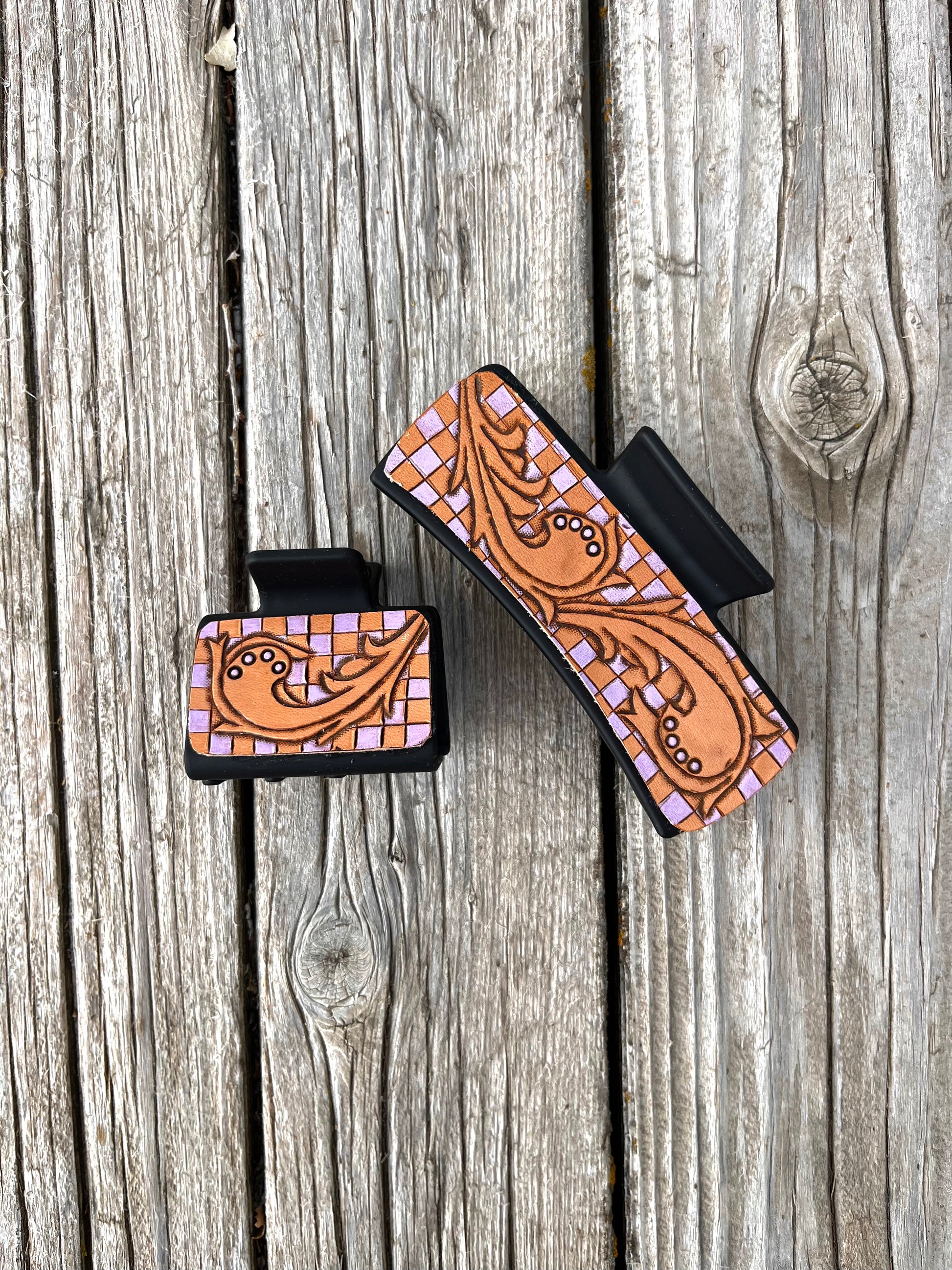 Checkered Leather Tooled Hair Clips
