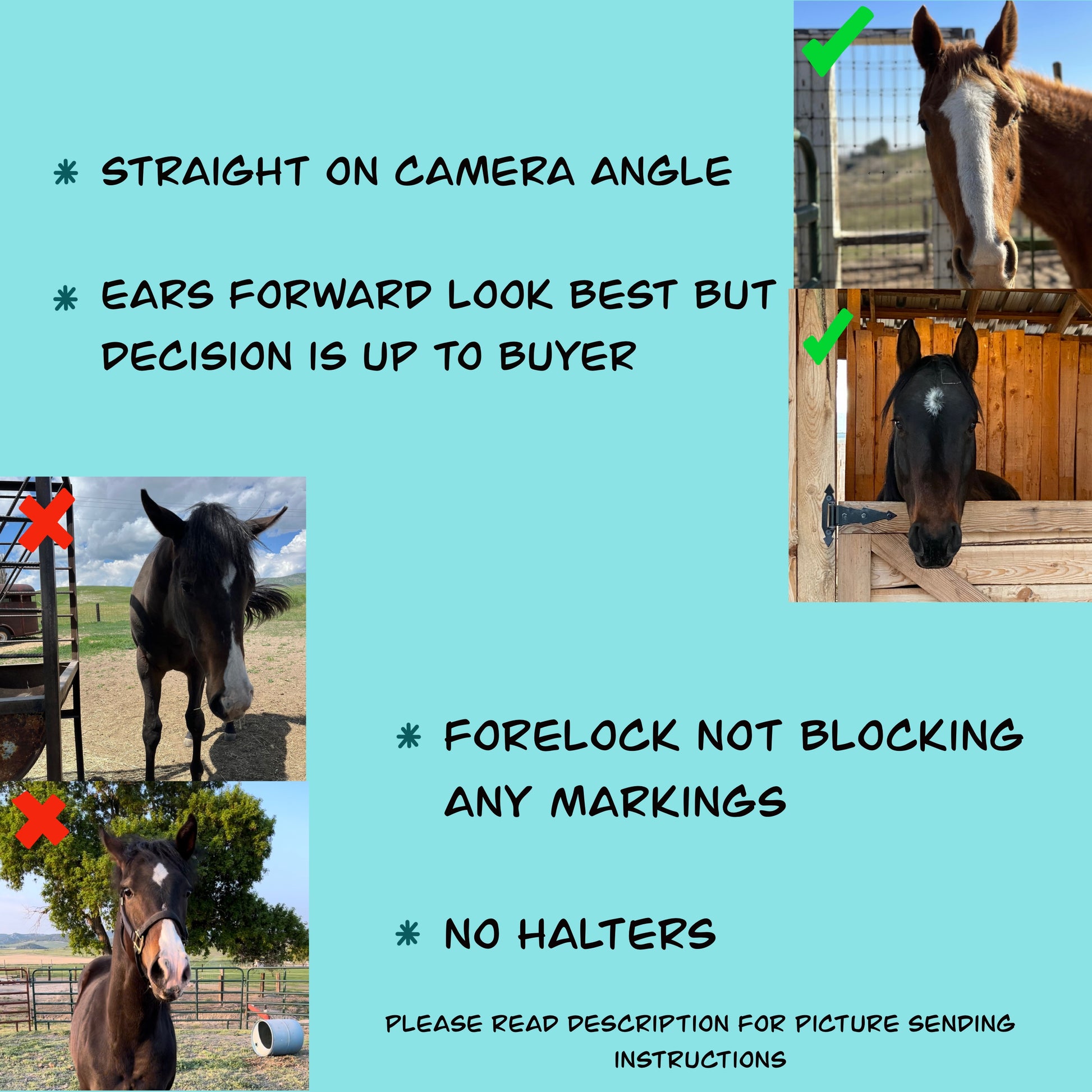 To order, enter your horses name into the description box and pick from the 10 different fonts available. DOUBLE CHECK YOUR SPELLING! There will be no refunds or exchanges due to buyers spelling error. Upload a clear, good quality picture following the guidelines listed in the picture.