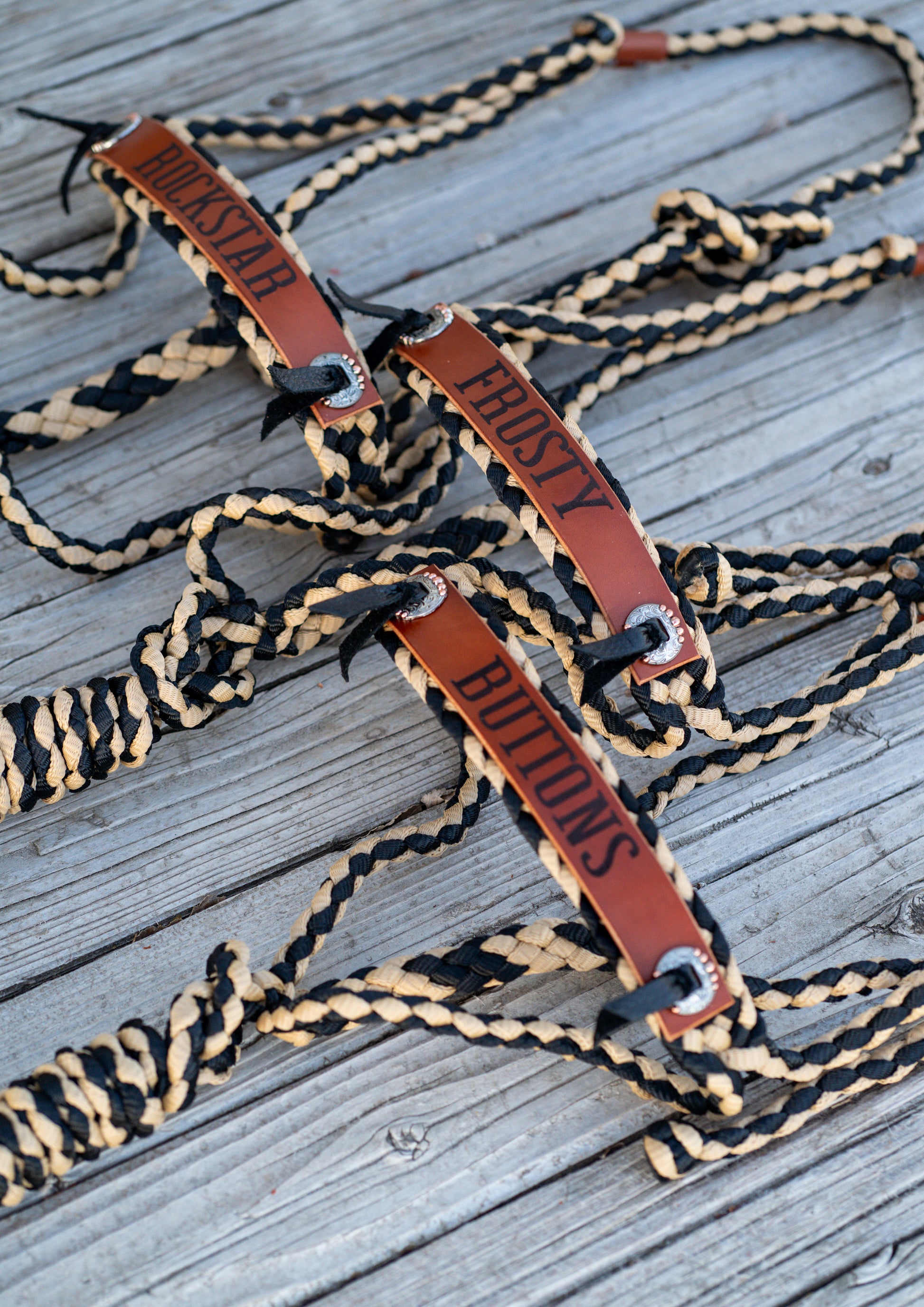 Hand braided mule tape halter with detachable 8ft lead rope and leather nose band. Sizes mini through draft available