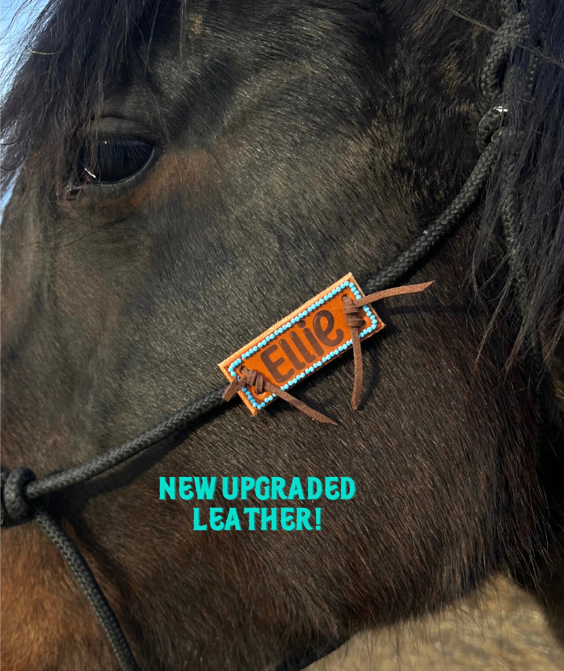 Made out of genuine leather, this name plate measures 1 inch wide (length depends on the size of name) and comes with two 6 inch pieces of eco soft lace making it easy to attach to any halter! This name tag comes with the outer edge beaded in whichever color or colors you choose (2 maximum).