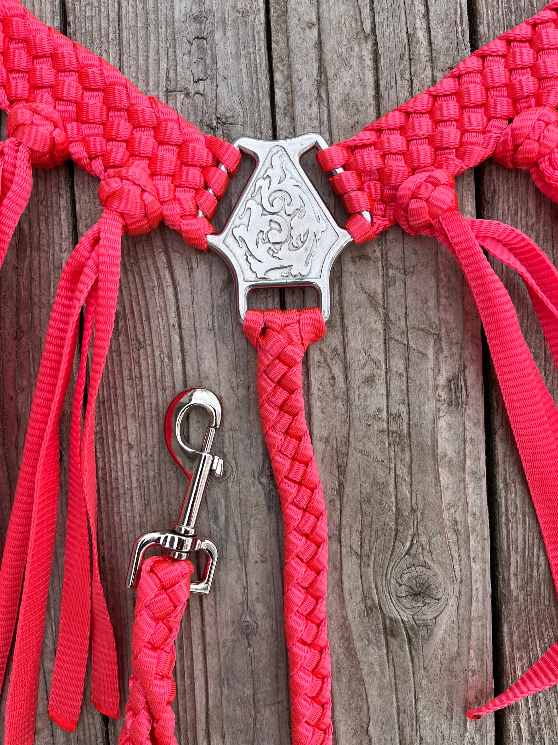 Horse size mule tape breast collar with fringe. The center plate and D rings are Jeremiah Watts brand which is known for its gorgeous appearance and durability.
