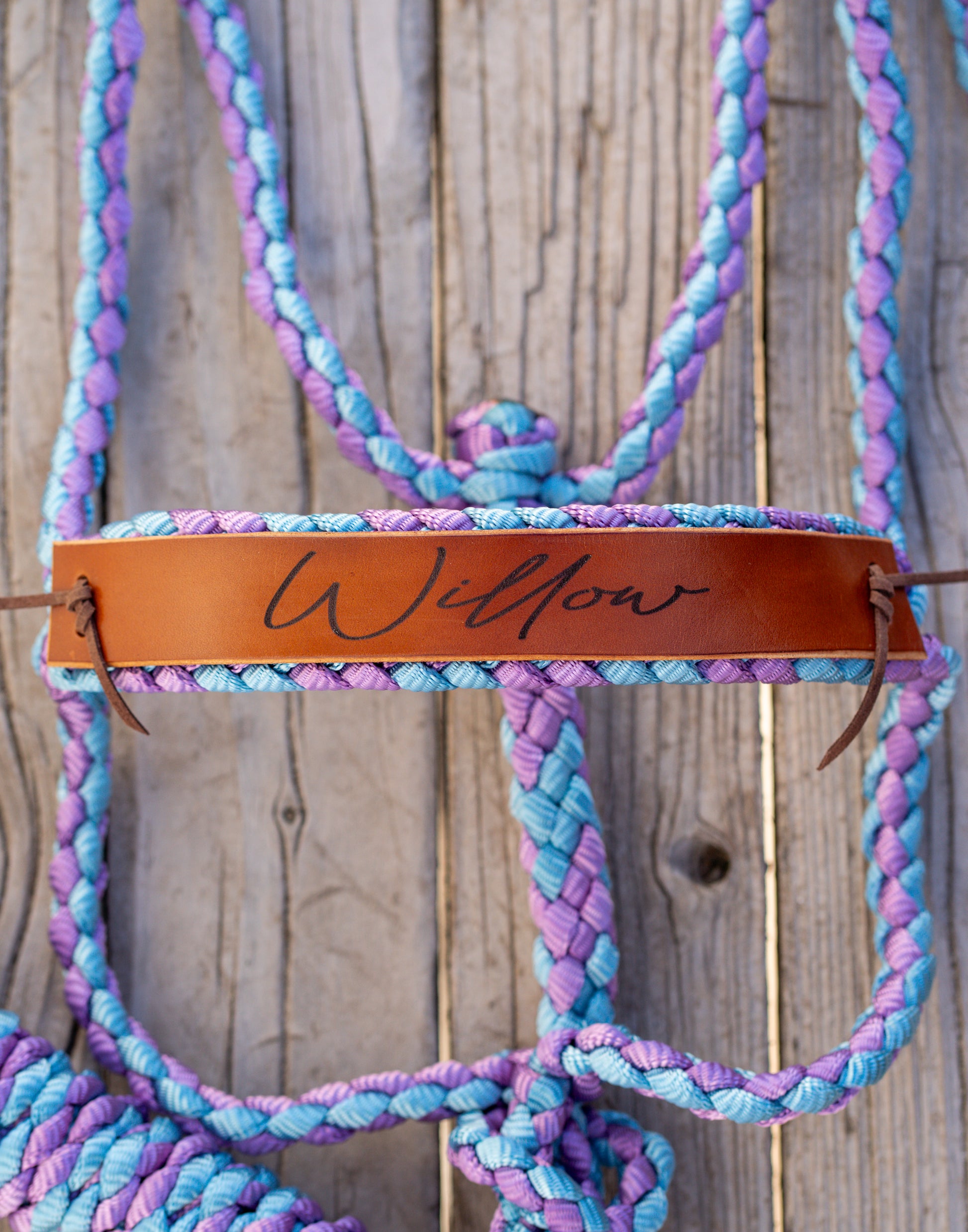 Mule tape halter with 8 ft detachable lead rope and customizable leather nose band. Sizes mini through draft available